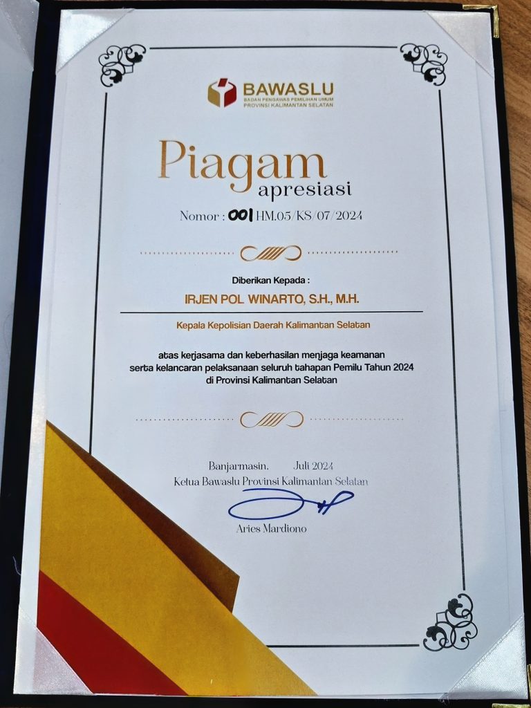 Piagam apresiasi dari Bawaslu Kalsel tersebut diserahkan langsung Ketua Bawaslu Kalsel Aries Mardiono didampingi jajaran anggota Bawaslu Kalsel Akhmad Mukhlis, Thessa Aji Budiono, Des Rizal Rachman Rofiat Darodjat serta Kepala Sekretariat Bawaslu Kalsel Teuku Dahsya Kusuma Putra. Piagam diberikan kepada Kapolda Kalsel dan 13 Kapolres Kabupaten /kota atau yang mewakili.