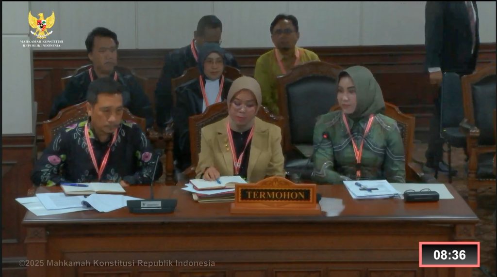 (dari Meja Bawaslu, Kanan) Anggota Bawaslu RI, Puadi saat mendampingi jajaran Bawaslu Kota Banjarbaru dalam agenda sidang Pemeriksaan Pendahuluan di Mahkamah Konstitusi, Jakarta (15/05/2025) / Foto: Edwin