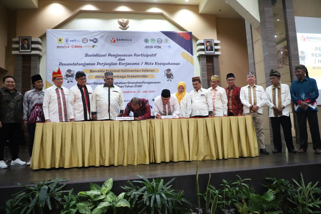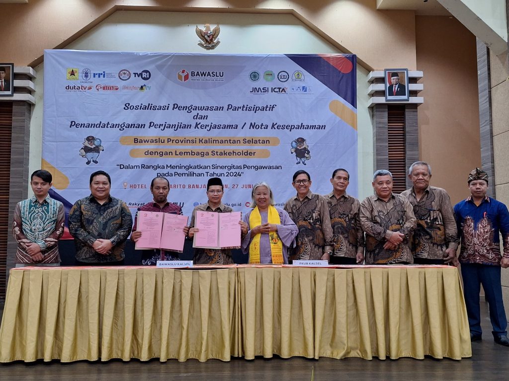 Banjarmasin, Bawaslu Kalsel - Demi mewujudkan Pemilihan Serentak 2024 di Kalimantan Selatan yang kondusif dan demokratis, Bawaslu Kalsel dan 16 lembaga stakeholder tandatangani MoU bersama untuk meningkatkan sinergitas pengawasan . Lembaga stakeholder tersebut meliputi organisasi keagamaan, kekeluargaan antar suku bangsa , organisasi media serta lembaga penyiaran publik , Kamis ,(27/6/2024)