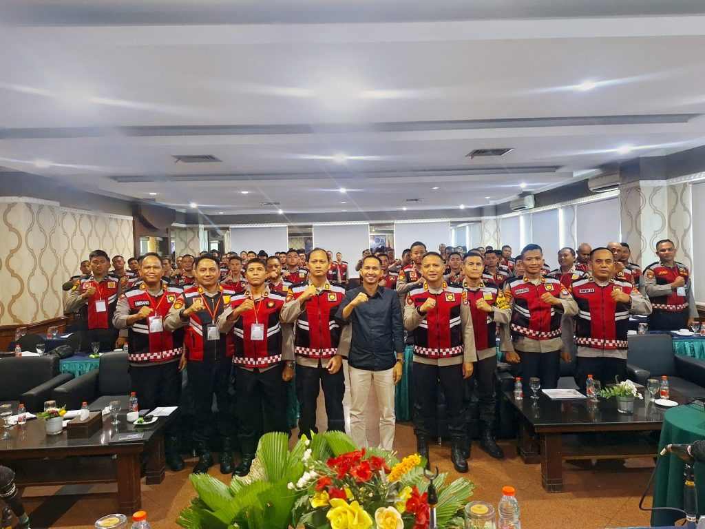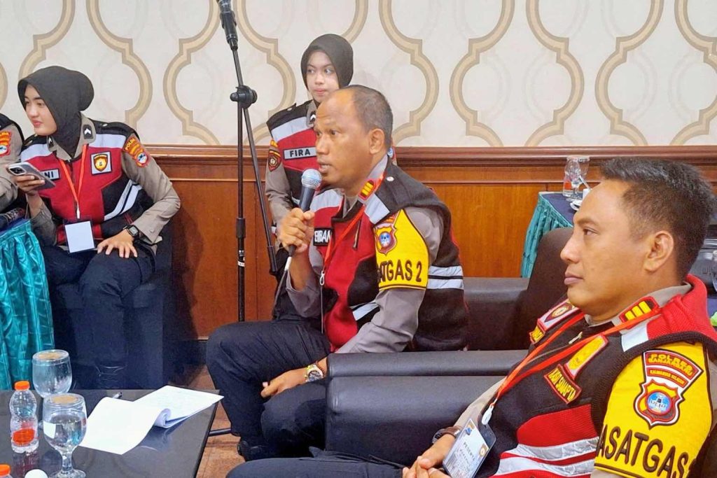 Anggota Bawaslu Kalsel Muhammad Radini (baju hitam) saat menjadi narasumber dalam Rakernis Fungsi Samapta Polda Kalsel di Banjarmasin ,Senin , (29/04/2024) / Foto: Reno