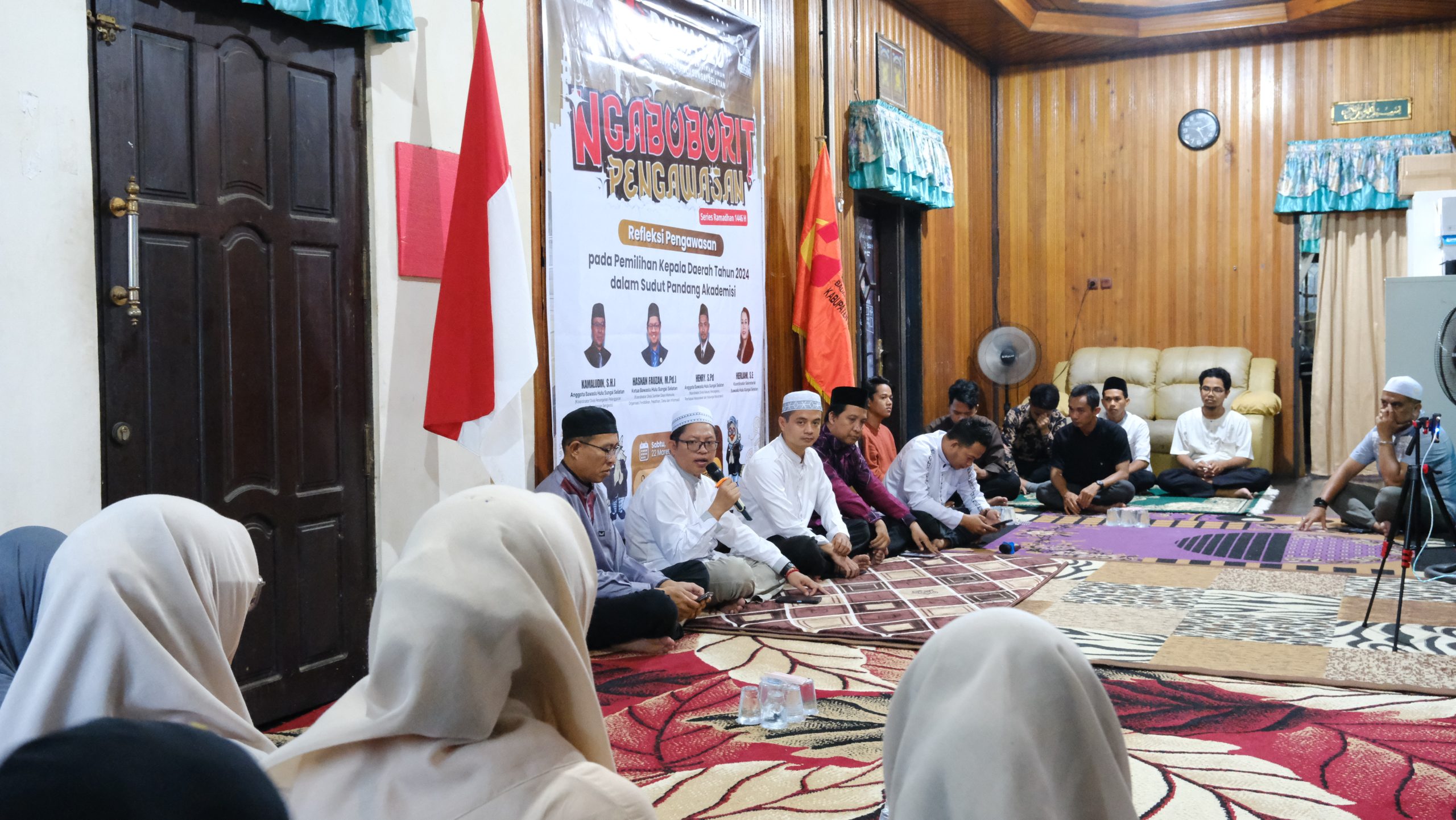 (tengah) Kordiv Pencegahan Bawaslu Kalsel, Thessa Aji Budiono saat memberikan sambutan pada giat Ngabuburit yang diselenggarakan oleh Bawaslu Kabupaten Hulu Sungai Selatan di Kandangan, Sabtu(22/03/2025) / Foto: Bagus