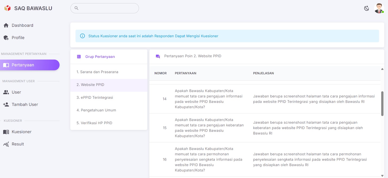 SAQ memuat lima kelompok pertanyaan utama, yaitu sarana dan prasarana, website PPID, e-PPID terintegrasi, pengetahuan umum, serta verifikasi perangkat PPID. Total 455 pertanyaan berhasil dijawab oleh seluruh 13 PPID Kabupaten/Kota di Kalimantan Selatan, dengan progres capaian 100 persen. Pengisian dan uji akses SAQ dilaksanakan hingga tenggat waktu 30 Juni 2025.