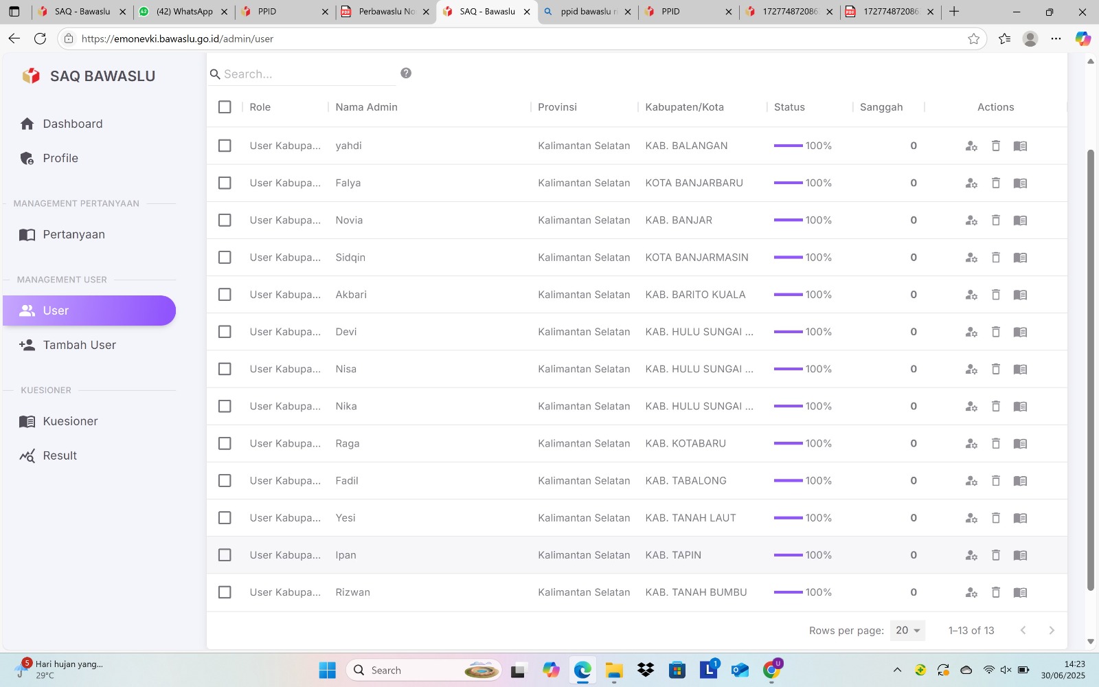 Banjarmasin, Bawaslu Kalsel - Pejabat Pengelola Informasi dan Dokumentasi (PPID) Bawaslu Kabupaten/Kota di Kalimantan Selatan telah menyelesaikan pengisian Self Assessment Questionnaire (SAQ) secara lengkap dan tepat waktu. Pengisian SAQ yang terdiri dari lima kelompok pertanyaan ini merupakan bagian dari kegiatan monitoring dan evaluasi (monev) keterbukaan informasi publik (KIP) yang dikoordinasikan oleh Bawaslu Provinsi Kalimantan Selatan. Senin(30/06/2025).