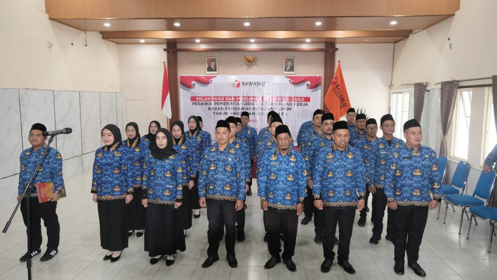 Kegiatan Pelantikan dan Pengambilan Sumpah/Janji Pegawai Pemerintah dengan Perjanjian Kerja (PPPK) Bawaslu Tahun Aggaran 2024 Tahal 1 secara daring di aula Bawaslu Kalsel , Selasa(1/7/2025) / Foto: Isya