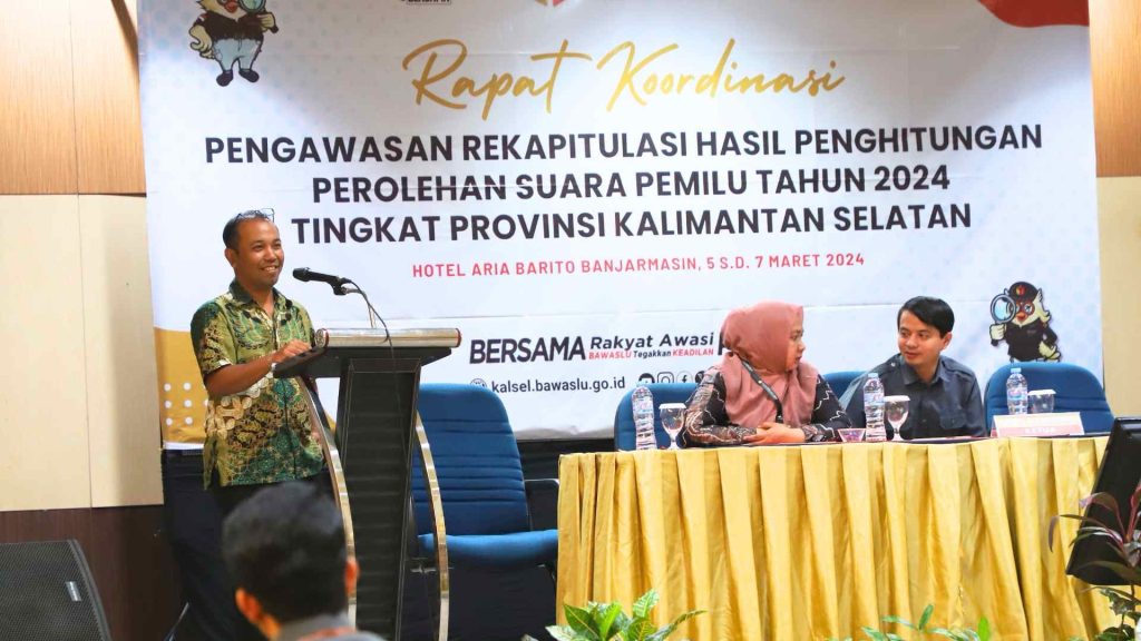 Anggota Bawaslu Kalsel Thessa Aji Budiono saat memberikan arahan dalam Rakor Pengawasan Hasil Penghitungan Perolehan Suara Tingkat Provinsi Pemilu 2024, Banjarmasin (05-03-2024)/ Foto: Edwin